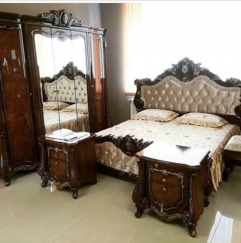 Продаётся спальний Белорусский гарнитур. Комплект включает кровать без матраса, прикроватные тумбы,пуф,туалетный столик с зеркалом, шкаф пятидверный, вместительный.