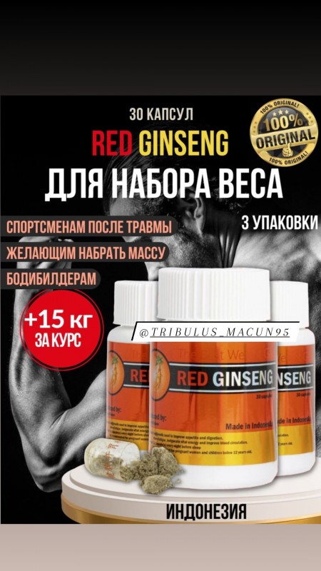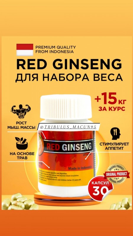 RED GINSENG ???????? Индонезия ???? ЭФФЕКТИВНО ДЛЯ: ????стимулирует аппетит, ????увеличивает пищеварительную способность, ????улучшает использование питательных веществ, ????улучшает естественную устойчивость организма к болезням. ???? Прибавляй вес без накопления избыточного жира, усиливая пищеварительную силу, успокаивая нервы, тем самым приводя к постепенному развитию сильных мышц и адиального тела ???? ИНДИКАЦИЯ: Традиционно используется для улучшения аппетита и пищеварения, облегчения усталости, активизации жизненной энергии и улучшения кровообращения ???? Объём : 30 капсул ???? ДОЗИРОВКА: ▪️1-2 капсулы (ов) каждую ночь перед сном ‼️Не рекомендуется для беременных женщин и детей в