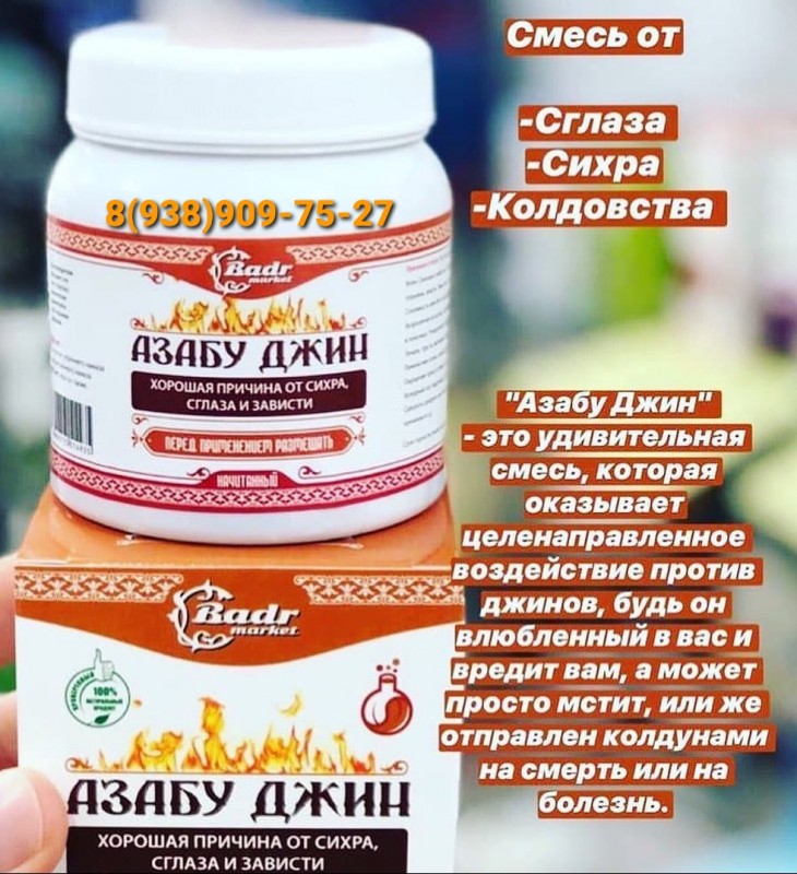 ????"Азабу Джин" - это очень целебная восточная смесь, которая оказывает усиленный эффек на различные виды заболеваний и состояний человека, как душевного, так и физического характера, вызванные по причине разных видов колдовства, поражение джином, сглаза и зависти. ????"Азабу Джин" - это удивительная смесь, которая оказывает целенаправленное воздействие против джинов, будь он влюбленный в вас и вредит вам, а может просто мстит, или же отправлен колдунами на смерть или на болезнь. ????"Азабу Джин" - это и вправду интригующая смесь, сладкая и без обидная на вкус, но эффективная и мощная в борьбе против джинов и разных видов колдовства, сглаза и зависти. Ведь в первую очередь от колдовства