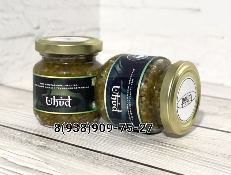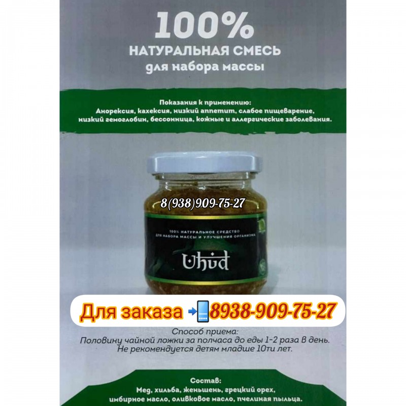Uhud - это 100% натуральный чистый продукт для наборы массы. • Укрепляет иммунитет • Поднимает аппетит • Принимается от усталости и много другое Состав: мёд, хильба, женьшень, грецкий орех, имбирное масло, оливковое масло, пчелиная пыльца.Результат у каждого может быть индивидуальным в зависимости от типа организма. Кто-то может набрать 5кг от 1 банки, а кто-то 10 кг. ❗️Не рекомендуется детям младше 10-ти лет. ⚠️Показания к применению: Анорексия, кахексия, низкий аппетит, слабое пищеварение, низкий гемоглобин, бессонница, кожные и аллергические заболевания. ⚠️Противопоказания: Гипперчувствительность, язва желудка, беременность, кормление грудью, грудной возраст (до 6. мес), задержка